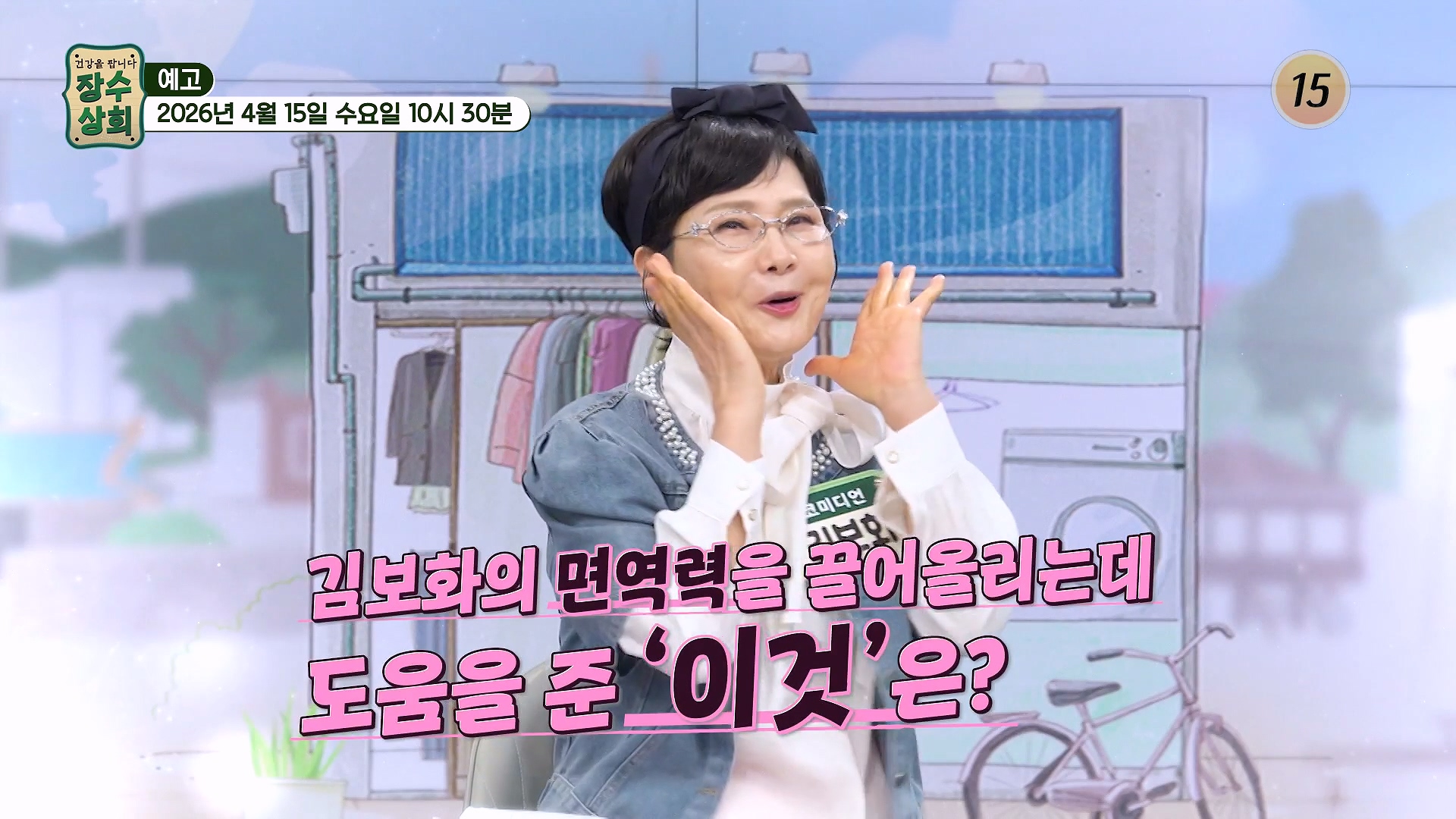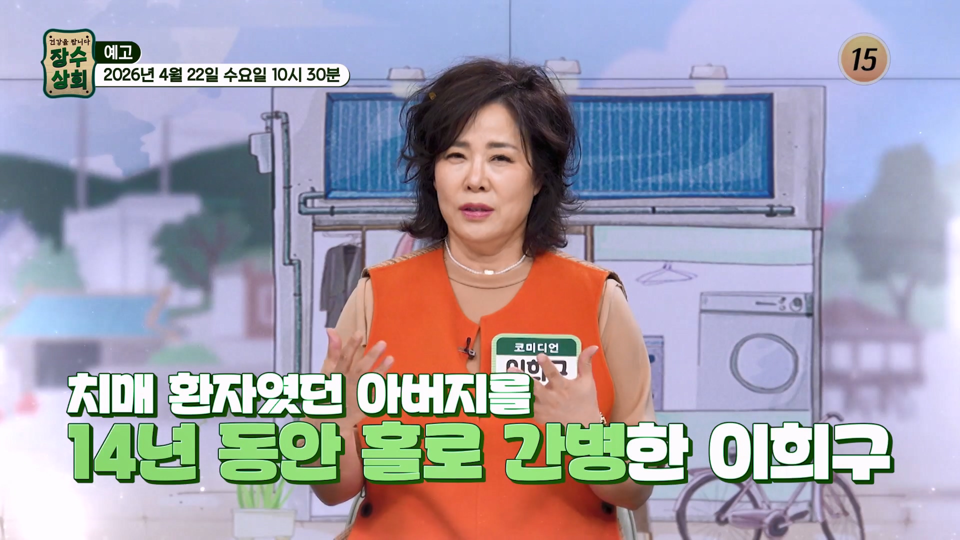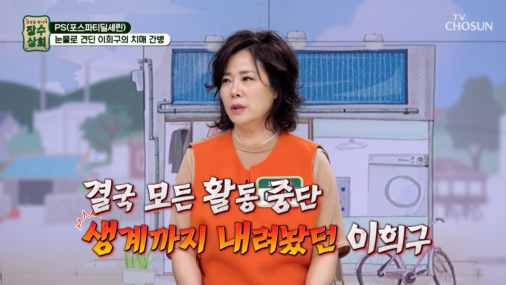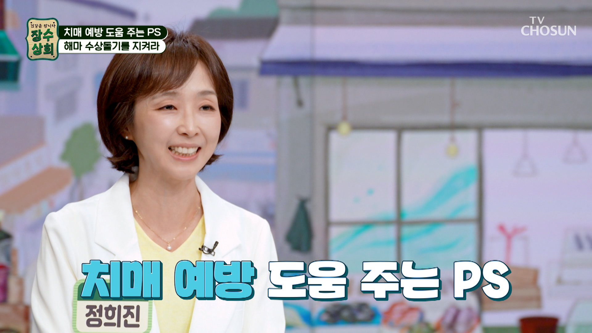 장수상회 프로그램 홈 스크랩 Loadingbar 로그인 후서비스 이용해 주세요. 로그인 지금은 시청할 수 없는 영상입니다.양해 부탁드립니다. 새로고침 이동통신망(5G/LTE 등)으로 재생 시데이터 통화료가 발생할 수 있습니다. 확인 ! 영상시청안내 설치/이용 중이신 AdBlock 솔루션으로 인해동영상 재생이 차단되었습니다. TV조선의 광고 노출을 허용해 주세요. 15 15세 미만은 시청할 수 없습니다. 장수상회 방송일 2026.04.22 장수상회 172회 스크랩 공유하기 공유 닫기 카카오톡 페이스북 트위터 URL 복사 코미디언 이희구의 뇌 건강 비결이 공개된다. 더보기 무제한 이용권 월 6,600원 재생목록 클립 댓글 정보 총 172개 최신회차 과거회차 많이보는회차 전체년도 2026 2025 2024 2023 2022 검색 장수상회 시청중 장수상회 172회 코미디언 이희구의 뇌 건강 비결이 공개된다. 방송일 2026.04.22(수) 1시간 36분 장수상회 장수상회 171회 코미디언 김보화의 건강법이 공개된다. 방송일 2026.04.15(수) 1시간 36분 장수상회 장수상회 170회 배우 김혜정의 혈당 관리법이 공개된다. 방송일 2026.04.08(수) 1시간 36분 장수상회 장수상회 169회 배우 서권순의 넘치는 활력의 비결이 공개된다. 방송일 2026.04.01(수) 1시간 36분 장수상회 장수상회 168회 건강한 수분 섭취법이 공개된다. 방송일 2026.03.25(수) 1시간 36분 장수상회 장수상회 167회 장미화의 폐 건강 비결이 공개된다. 방송일 2026.03.18(수) 1시간 35분 장수상회 장수상회 166회 국민 배우 사미자의 건강 비결이 공개된다. 방송일 2026.03.11(수) 1시간 36분 장수상회 장수상회 165회 김기현 & 손영화 부부의 건강법이 공개된다. 방송일 2026.03.04(수) 1시간 36분 장수상회 장수상회 164회 홍여진의 독소 배출법이 공개된다. 방송일 2026.02.25(수) 1시간 36분 장수상회 장수상회 163회 국민가수 현숙의 건강 비결이 공개된다. 방송일 2026.02.18(수) 1시간 36분 검색 결과가 없습니다. 검색 초기화 1 2 3 4 5 6 7 8 9 10 다음 마지막으로 총 602개 최신회차 과거회차 많이보는회차 전체회차 172화 171화 170화 169화 168화 167화 166화 165화 164화 163화 162화 161화 160화 159화 158화 157화 156화 155화 154화 153화 152화 151화 150화 149화 148화 147화 146화 145화 144화 143화 142화 141화 140화 139화 138화 137화 136화 135화 134화 133화 132화 131화 130화 129화 128화 127화 126화 125화 124화 123화 122화 121화 120화 119화 118화 117화 116화 115화 114화 113화 112화 111화 110화 109화 108화 107화 106화 105화 104화 103화 102화 101화 100화 99화 98화 97화 96화 95화 94화 93화 92화 91화 90화 89화 88화 87화 86화 85화 84화 83화 82화 81화 80화 79화 78화 77화 76화 75화 74화 73화 72화 71화 70화 69화 68화 67화 66화 65화 64화 63화 62화 61화 60화 59화 58화 57화 56화 55화 54화 53화 52화 51화 50화 49화 48화 47화 46화 45화 44화 43화 42화 41화 40화 39화 38화 37화 36화 35화 34화 33화 32화 31화 30화 29화 28화 27화 26화 25화 24화 23화 22화 21화 20화 19화 18화 17화 16화 15화 14화 13화 12화 11화 10화 9화 8화 7화 6화 5화 4화 3화 2화 1화 검색 💙포스파티딜세린💙 뇌 기능 활성도 UP❣ 치매 가속 페달은 브레이크💥 TV CHOSUN 260422 방송 172회 방송일 2026.04.22(수) 치매 가족력👨👩👧 중증 치매가 온 아버지 간병 중👴 찾아온 어머니의 치매👵💧 TV CHOSUN 260422 방송 172회 방송일 2026.04.22(수) 치매 환자였던 아버지를 14년 동안 홀로 간병한 이희구_장수상회 172회 예고 TV CHOSUN 260422 방송 172회 방송일 2026.04.22(수) 💛알부민💛 노폐물 청소하고🧹 영양소를 빠르게 운반해 주는 컨트롤 타워🗼 TV CHOSUN 260415 방송 171회 방송일 2026.04.15(수) 전 세계를 강타한💥 무시무시한 바이러스에 맞설 열쇠🗝️ 면역력 TV CHOSUN 260415 방송 171회 방송일 2026.04.15(수) 활기찬 에너지가 샘솟는 코미디계의 전설 김보화의 건강 비결!_장수상회 171회 예고 TV CHOSUN 260415 방송 171회 방송일 2026.04.15(수) 근육이 줄어들면💪 당뇨병 위험도가 함께 오른다고?😱 TV CHOSUN 260408 방송 170회 방송일 2026.04.08(수) ☕흑염소 진액☕ 당뇨 가족력 극복한 김혜정의 혈당 관리법😤 TV CHOSUN 260408 방송 170회 방송일 2026.04.08(수) 배우 김혜정의 특별한 건강 비결_장수상회 170회 예고 TV CHOSUN 260408 방송 170회 방송일 2026.04.08(수) 노년기 삶을 위협하는 대상포진💥 원인은 면역력 저하❓😨 TV CHOSUN 260401 방송 169회 방송일 2026.04.01(수) 🌟알부민🌟 최강 동안🎀 서권순의 기력 & 활력 충전 비법⚡ TV CHOSUN 260401 방송 169회 방송일 2026.04.01(수) 생명을 위협하는 뇌부종, 폐부종의 위험 신호_장수상회 169회 예고 TV CHOSUN 260401 방송 169회 방송일 2026.04.01(수) 🍋레몬자몽즙🍊 뇌종양 수술 후 불어난 체중 & 염증 관리 성공한 비결✨ TV CHOSUN 260325 방송 168회 방송일 2026.03.25(수) 식물처럼🌱 사람에게도 꼭 필요한 물‼ 하지만 대한민국은 수분 부족 국가😲❓ TV CHOSUN 260325 방송 168회 방송일 2026.03.25(수) 힘든 시간을 극복할 수 있었던 그녀의 건강 비법은?_장수상회 168회 예고 TV CHOSUN 260325 방송 168회 방송일 2026.03.25(수) 🤎볶음 맥문동 진액🤎 면역력 UP↑ 폐를 촉촉하게 해💧 염증은 OUT TV CHOSUN 260318 방송 167회 방송일 2026.03.18(수) 무서운 가족력😱 폐와 목소리에 더욱 예민한👀 장미화의 건강 사수 비결 TV CHOSUN 260318 방송 167회 방송일 2026.03.18(수) 촉촉